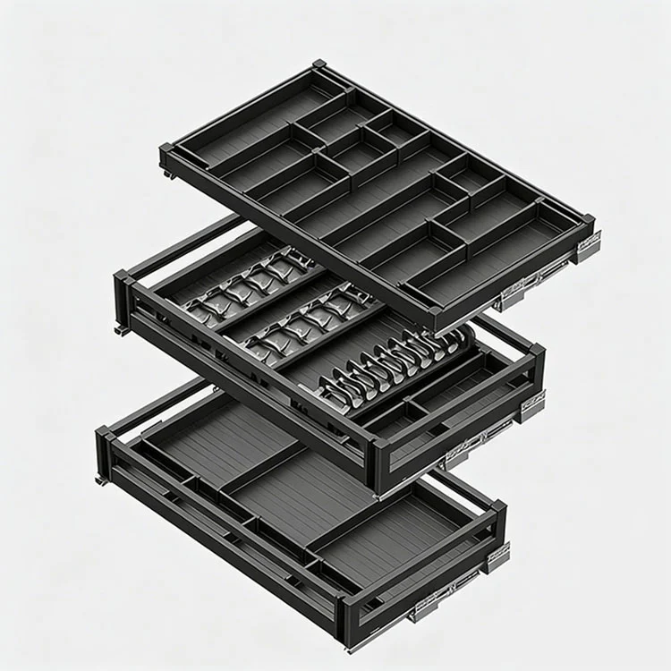 4. Hovedanvendelse:Løser problemet med rodet intern opbevaring i køkkenskabe, hvilket muliggør mere ordnet placering af service og køkkenudstyr. Den indlejrede installation optager ikke køkkenbordets plads, hvilket forbedrer køkkenets generelle renlighed og brugseffektivitet.