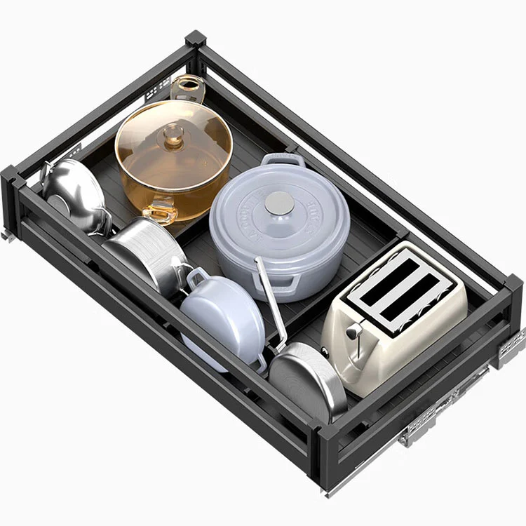 Denne udtrækskurv af aluminiumslegering er et indlejret køkkenopbevaringsudstyr, der hovedsageligt bruges til klassificeret opbevaring af køkkenartikler såsom fade, gryder og krydderier. Denne køkkenskabsskuffe er en specialdesignet indlejret opbevaringsløsning til moderne køkkener. Med et lagdelt design og praktiske funktioner i kerne, løser den nemt problemerne med rodet intern opbevaring og lav pladsudnyttelse i skabene og er en fremragende hjælper til køkkenopbevaring.