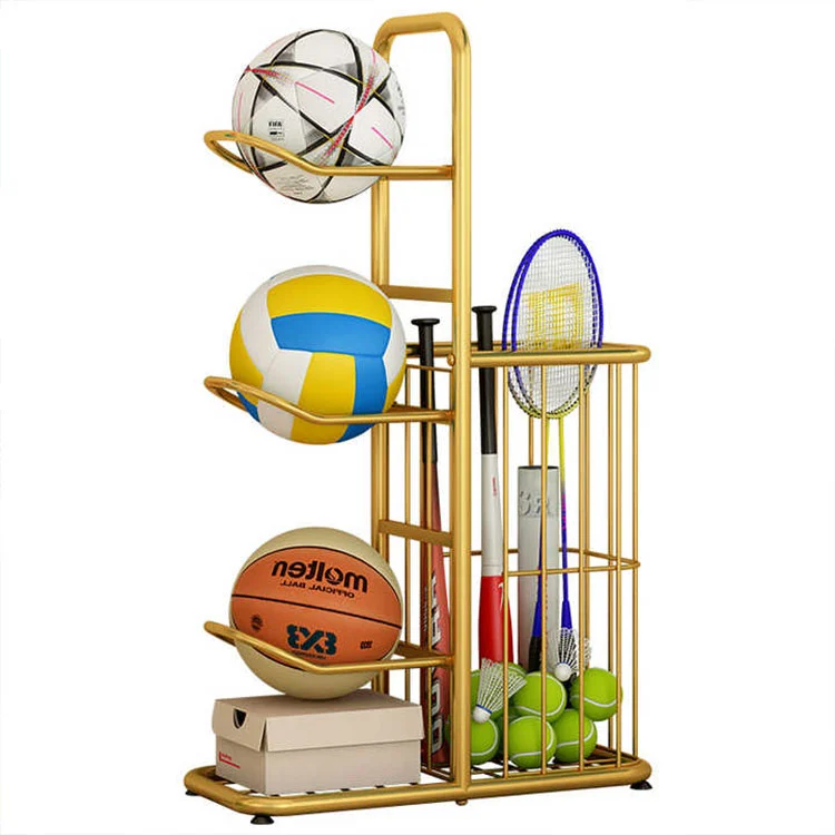 A: Tag basketball som eksempel: Det nederste lag kan rumme 4-6 basketball; mellemlaget kan rumme 6-8 volleyballs eller fodbolde; det øverste lag kan rumme 12+ badmintonketchere + flere små bolde. Den samlede kapacitet er tilstrækkelig til familiebrug eller mindre teambrug.